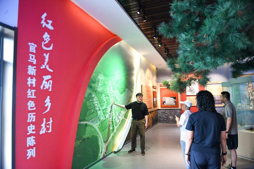 2025年8月11日,抗日民族英雄楊靖宇將軍的曾孫馬鋮明(左一)在吉林省磐石市官馬新村紅色歷史陳列館為游客介紹抗聯(lián)歷史。