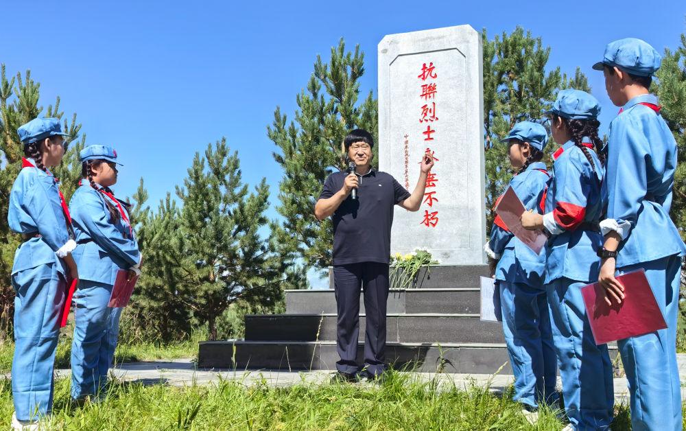 2025年8月14日,參加“重走抗聯(lián)路”活動(dòng)的學(xué)生在內(nèi)蒙古呼倫貝爾市阿榮旗六合鎮(zhèn)“紅軍崗”聆聽東北抗聯(lián)事跡介紹。1940年,東北抗聯(lián)第三路軍在此與日偽軍激戰(zhàn),多名戰(zhàn)士為保護(hù)村民壯烈犧牲。當(dāng)?shù)厝罕娒半U(xiǎn)將5位烈士遺體安葬于此,并立碑紀(jì)念。