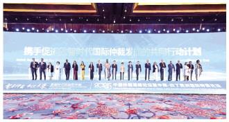 圖為多國仲裁界人士在論壇主席臺發(fā)布《攜手促進數(shù)智時代國際仲裁發(fā)展的共同行動計劃》。 貿(mào)仲供圖