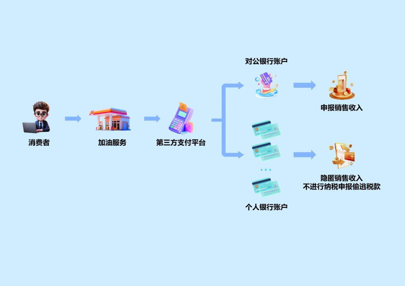 經(jīng)過(guò)比對(duì),發(fā)現(xiàn)上述收銀憑證所記載的收銀信息與該加油站的對(duì)公賬戶銀行流水記錄不符。檢查人員隨即圍繞這一關(guān)鍵疑點(diǎn)深入核查,逐步鎖定關(guān)聯(lián)證據(jù),形成了完整的證據(jù)鏈。最終成功還原了案件的事實(shí)與真相:該加油站通過(guò)在第三方收款平臺(tái),綁定個(gè)人賬戶接收加油款項(xiàng),以此規(guī)避對(duì)公賬戶核算,試圖掩蓋真實(shí)銷售數(shù)據(jù),形成了一條隱蔽的賬外收款鏈條。