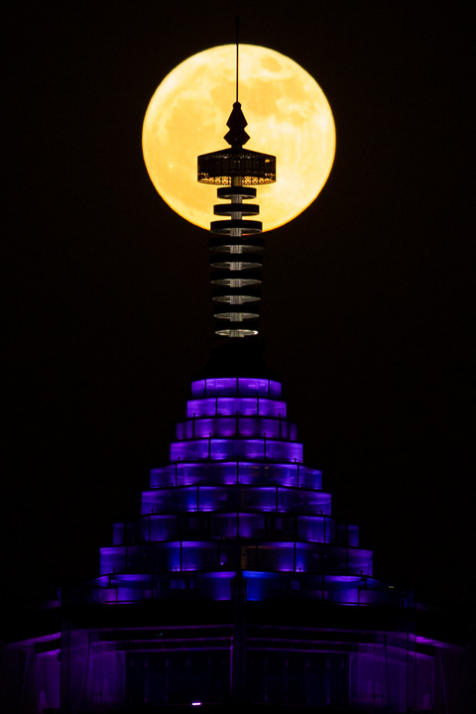 2022年6月14日,江蘇南京大報(bào)恩塔與“超級(jí)月亮”相映成景。新華社發(fā)(蘇陽(yáng) 攝)