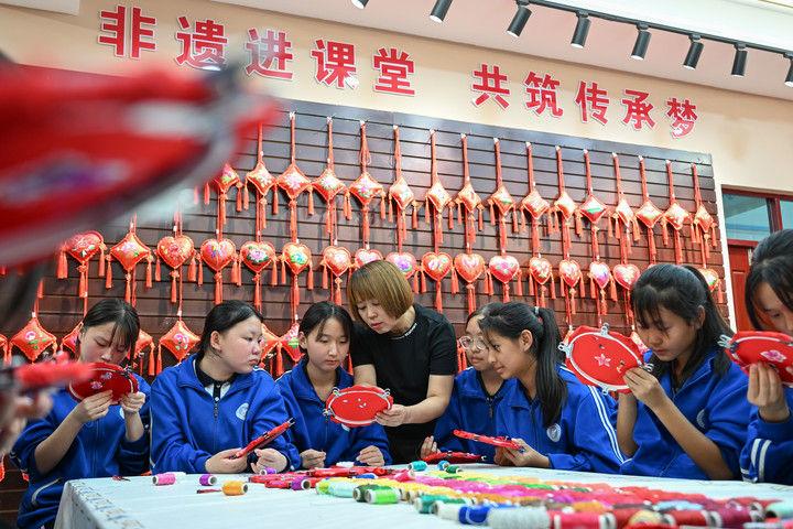 2025年9月26日,內(nèi)蒙古興安盟科右中旗巴彥呼舒第六中學(xué)美術(shù)教師、非遺代表性傳承人吳斯琴(左四)指導(dǎo)學(xué)生刺繡。近年來,內(nèi)蒙古興安盟科爾沁右翼中旗巴彥呼舒第六中學(xué)將當?shù)貒壹壏沁z圖什業(yè)圖刺繡引入校園,開設(shè)校本課程,并成立興趣社團,在豐富校園文化生活的同時,讓學(xué)生們近距離感受非遺的魅力,弘揚和傳承中華優(yōu)秀傳統(tǒng)文化。