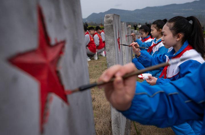 2025年3月31日,在四川川陜革命根據(jù)地紅軍烈士陵園,紅軍小學(xué)學(xué)生為無名烈士墓碑上的五角星描紅。當日,來自四川通江縣的300名中小學(xué)青少年代表,齊聚川陜革命根據(jù)地紅軍烈士陵園,在莊嚴肅穆的儀式中開啟了一堂“紀念碑下的思政課”,為埋葬在這里的25048名紅軍烈士寄去哀思。