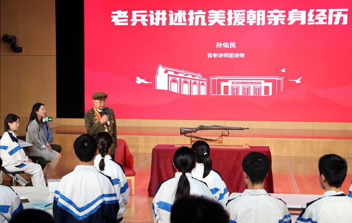 2021年10月25日,老兵代表在上海中學(xué)的課堂上講述抗美援朝的親身經(jīng)歷。這堂特別的思政課是中共一大紀念館“百物進百校,百講證百年”活動的第一講,紀念館從館藏中精選100件革命文物,帶進學(xué)校課堂,以“文物進校園”的形式,用好用活紅色資源,賡續(xù)紅色血脈。