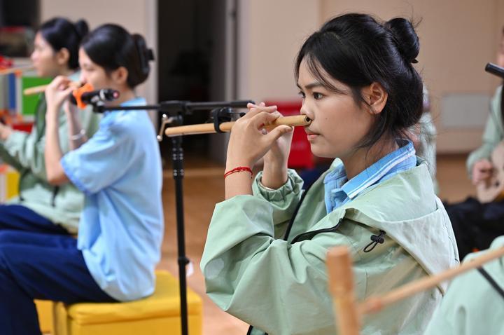2025年6月12日,海南省民族技工學(xué)校學(xué)生在練習黎族鼻簫。近年來,海南省五指山市打造“非遺進校園”工程,在14所公辦中小學(xué)開設(shè)非遺課程,培養(yǎng)青少年對中華優(yōu)秀傳統(tǒng)文化的熱愛,助力非遺傳承與發(fā)展。