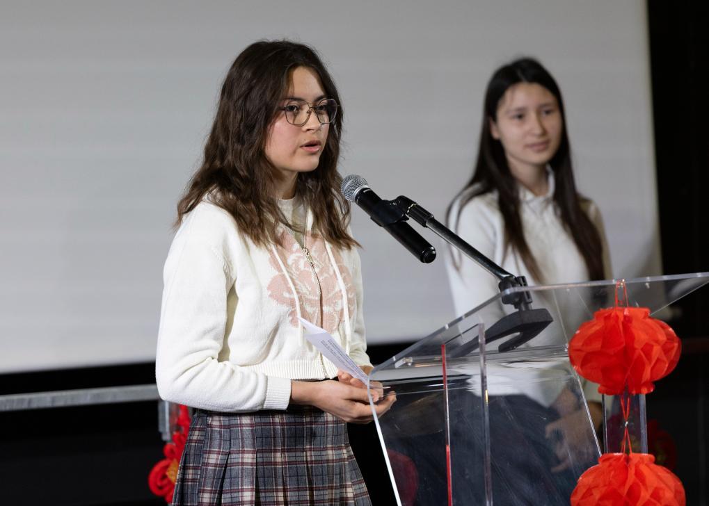 3月12日,在法國普羅旺斯-阿爾卑斯-藍色海岸大區(qū)國際學(xué)校,中國駐馬賽總領(lǐng)館向?qū)W校轉(zhuǎn)交習(xí)近平主席復(fù)信。這是該校中文班學(xué)生伊西絲在活動現(xiàn)場發(fā)言。新華社記者 鄔惠我 攝