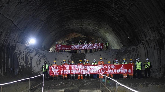 11月15日,施工人員在印度尼西亞西爪哇省慶祝雅萬高鐵7號隧道貫通。