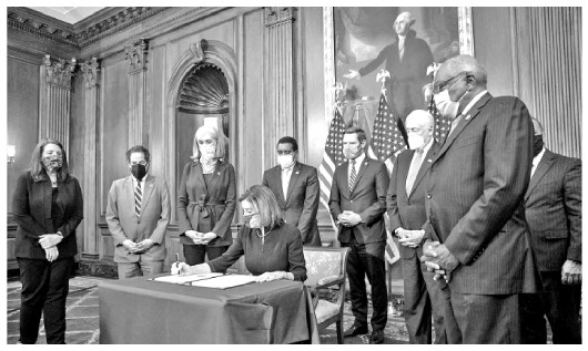 當(dāng)?shù)貢r間1月11日,鑒于6日發(fā)生的國會騷亂事件,眾議院民主黨人正式提交針對特朗普的彈劾條款草案。彈劾條款指控特朗普“煽動叛亂”,要求對其進(jìn)行“彈劾和審判,并免除其總統(tǒng)職務(wù),取消其擁有的相關(guān)榮譽(yù)、信用和有酬職位資格”。13日下午,美國國會眾議院兩黨議員經(jīng)過辯論后以232票贊成、197票反對,通過了針對特朗普的彈劾案。眾議院全體民主黨人以及10名共和黨人投了贊成票。