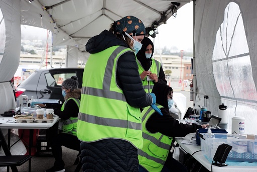 4月29日,在美國加利福尼亞州舊金山城市學(xué)院,工作人員在新冠疫苗接種點(diǎn)的帳篷里忙碌。(新華社記者吳曉凌攝)