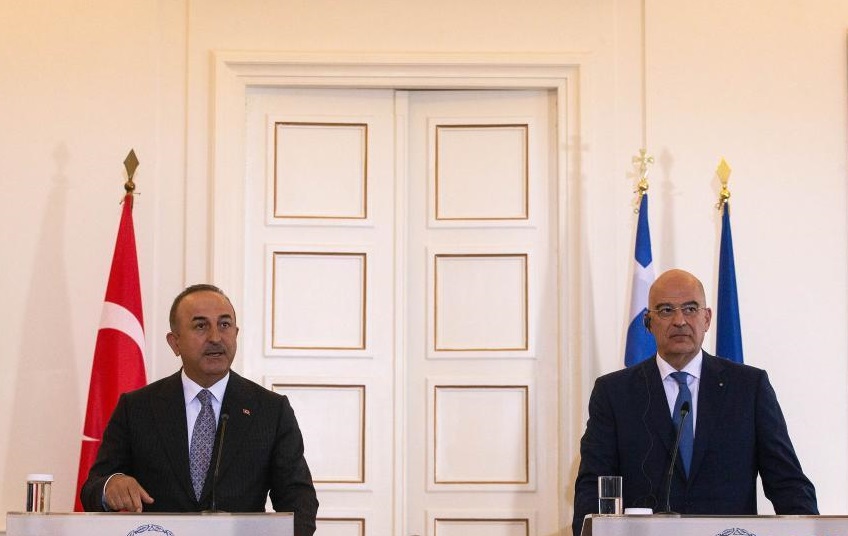 5月31日,希臘外長登迪亞斯(右)和來訪的土耳其外長恰武什奧盧在雅典參加新聞發(fā)布會。