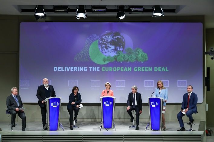 7月14日,歐盟委員會(huì)主席馮德萊恩(左四)、第一副主席蒂默曼斯(左二)等在比利時(shí)布魯塞爾出席應(yīng)對氣候變化一攬子計(jì)劃提案發(fā)布會(huì)。