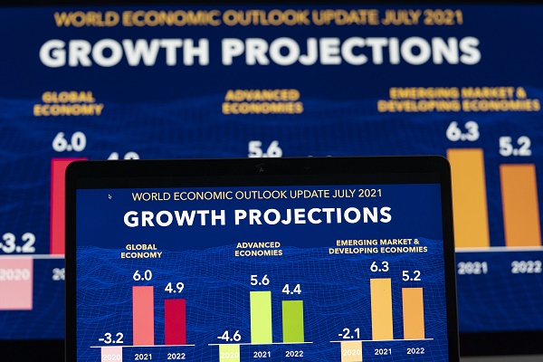這是7月27日拍攝的國(guó)際貨幣基金組織(IMF)發(fā)布的《世界經(jīng)濟(jì)展望報(bào)告》中的2021年全球經(jīng)濟(jì)增長(zhǎng)預(yù)期圖表。