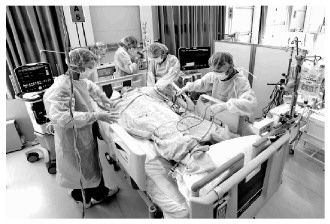 圖為日本大阪一家醫(yī)院的醫(yī)護(hù)人員治療新冠患者。 圖片來(lái)源:人民視覺(jué)