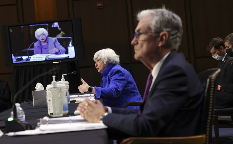 9月28日,美國(guó)財(cái)政部長(zhǎng)耶倫(左一)在華盛頓出席國(guó)會(huì)參議院銀行、住房和城市事務(wù)委員會(huì)聽(tīng)證會(huì)。