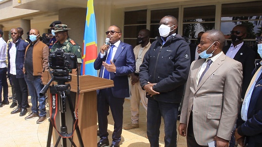 11月3日,剛果(金)南基伍省省長卡西(中)在該省首府布卡武市就當(dāng)天凌晨發(fā)生的襲擊召開新聞發(fā)布會(huì)。