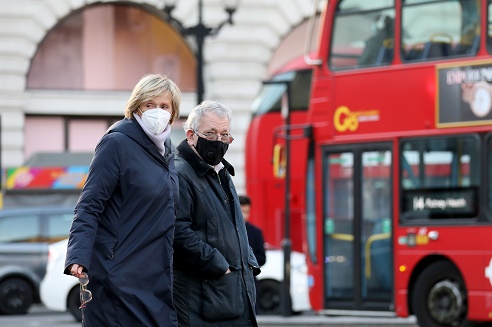 11月25日,人們在英國倫敦佩戴口罩出行。