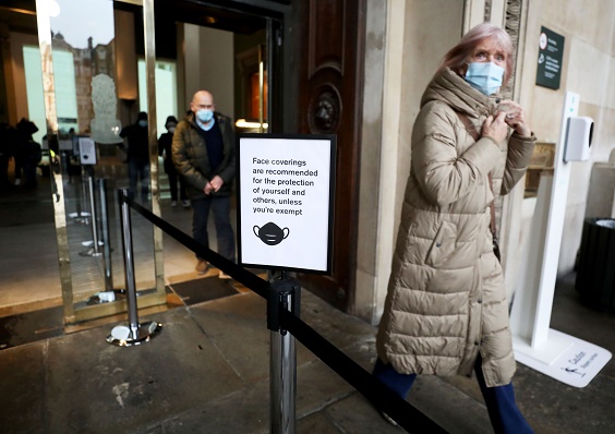 12月7日,人們走過(guò)英國(guó)倫敦大英博物館入口處的防疫告示。