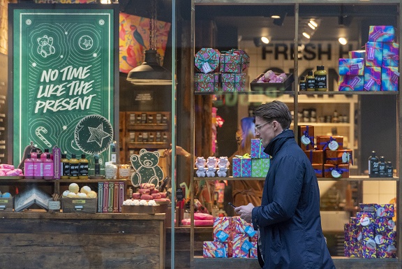 12月16日,一名男子走過英國倫敦街頭一家商店。