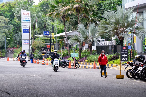 2月17日,人們佩戴口罩經(jīng)過印度尼西亞首都雅加達的一棟寫字樓前。