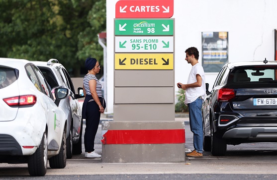 8月18日, 人們在法國巴黎郊區(qū)的一處加油站加油。