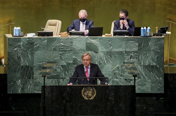 9月20日,在位于紐約的聯(lián)合國(guó)總部,聯(lián)合國(guó)秘書長(zhǎng)古特雷斯(下)在聯(lián)合國(guó)大會(huì)一般性辯論開幕式上講話。 新華社記者 王迎 攝