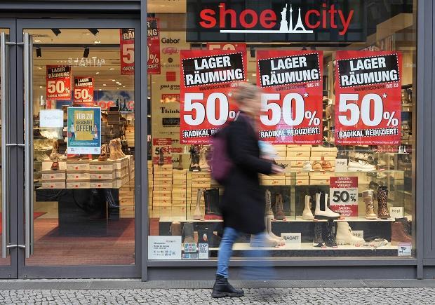 1日,一名女子經(jīng)過德國柏林的一家打折店鋪。新華社發(fā)(斯特凡·蔡茨攝)