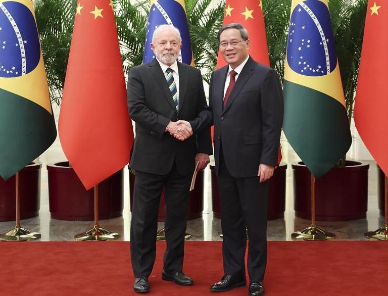 4月14日,國(guó)務(wù)院總理李強(qiáng)在北京人民大會(huì)堂會(huì)見來(lái)華進(jìn)行國(guó)事訪問(wèn)的巴西總統(tǒng)盧拉。新華社記者 丁海濤 攝