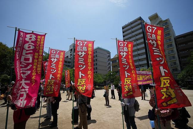 5月21日,民眾聚集在日本廣島袋町公園,抗議七國(guó)集團(tuán)峰會(huì)。新華社記者 張笑宇 攝