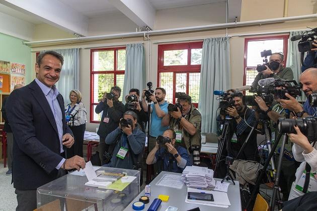圖為5月21日,希臘總理、新民主黨領(lǐng)導(dǎo)人基里亞科斯·米佐塔基斯在雅典一處投票站投票。新華社發(fā)(馬里奧斯·羅洛斯攝)