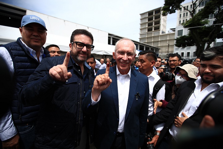 圖為25日,曾擔(dān)任聯(lián)合國前秘書長潘基文辦公室主任的“Cabal”黨候選人埃德蒙·穆萊特(左三)在危地馬拉首都危地馬拉城一處投票站參加投票。新華社發(fā)(烏利塞斯·羅德里格斯攝)