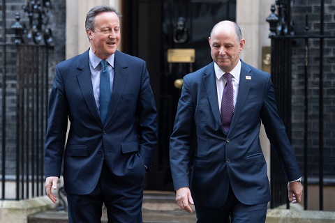 圖為11月13日,在英國(guó)倫敦,新任外交大臣戴維·卡梅倫(左)走出唐寧街10號(hào)首相府。新華社發(fā)