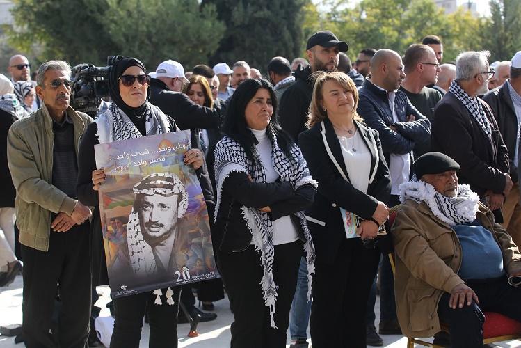 11月11日,在約旦河西岸城市拉姆安拉,民眾集會(huì)紀(jì)念巴勒斯坦前領(lǐng)導(dǎo)人阿拉法特逝世20周年。新華社發(fā)(尼達(dá)爾·艾仕塔耶?dāng)z)