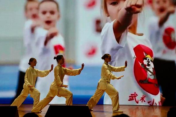 莫斯科體育實驗學校體教中心學生表演武術(shù)。