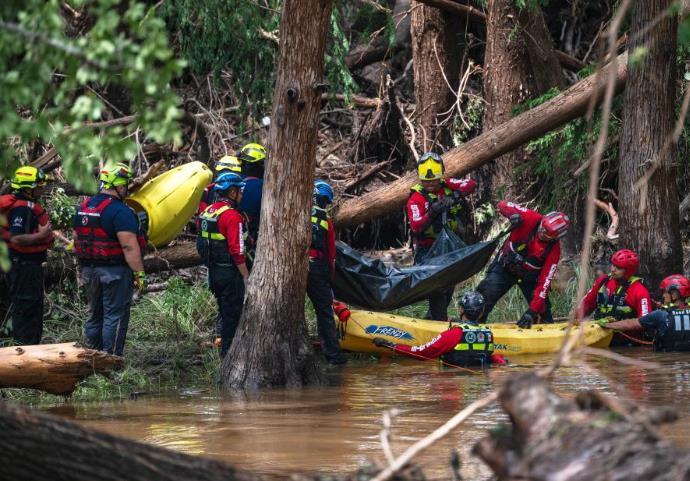 7月7日,救援人員在美國得克薩斯州英格勒姆遭洪水侵襲的區(qū)域搬運遇難者的遺體。新華社/美聯(lián)
