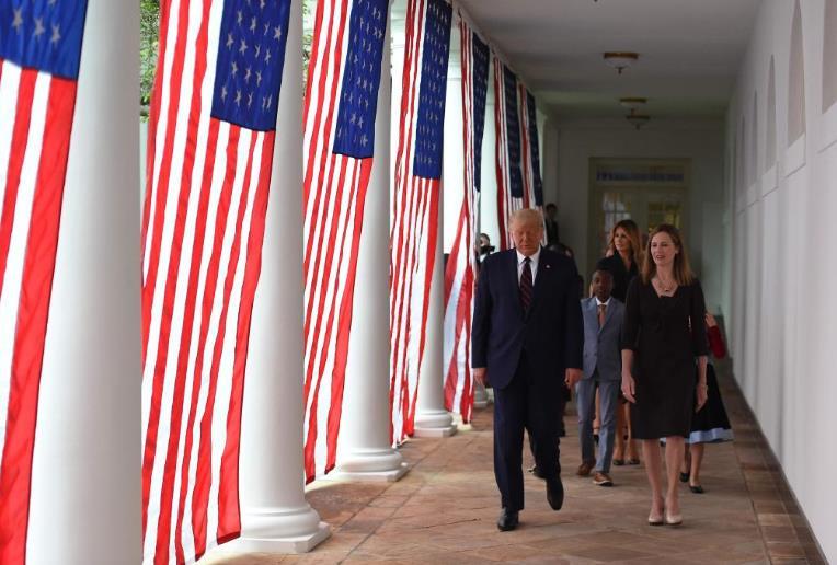 2020年9月26日,在第一任期的美國總統(tǒng)特朗普(前左)和時任美國聯(lián)邦第七巡回上訴法院法官艾米·科尼·巴雷特(前右)出席在白宮舉行的提名公布活動。新華社/法新