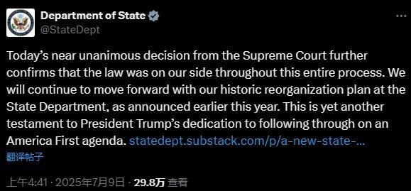 美國國務(wù)院當(dāng)天在社交媒體上發(fā)文說:“我們將繼續(xù)推進國務(wù)院的歷史性重組工作?!?/p>