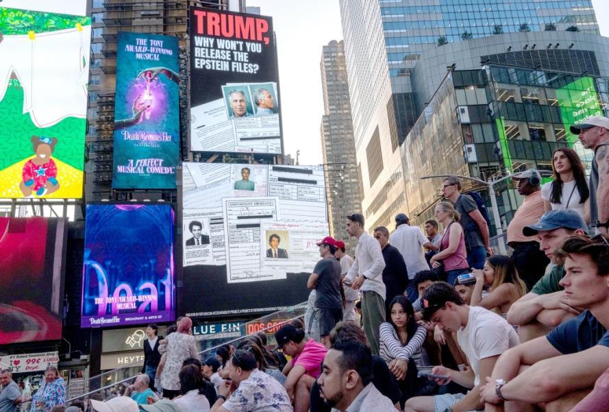圖為當(dāng)?shù)貢r(shí)間7月23日,美國紐約時(shí)報(bào)廣場廣告牌呼吁公開愛潑斯坦案所有文件。 CFP供圖