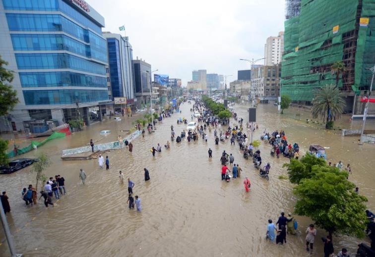 8月19日,在巴基斯坦南部港口城市卡拉奇,當?shù)鼐用裨诒┯赀^后涉水出行。新華社發(fā)