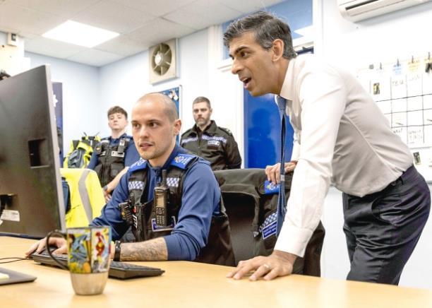 當(dāng)?shù)貢r(shí)間2024年4月10日,英國蘇塞克斯郡,時(shí)任英國首相蘇納克在霍舍姆警察局觀看監(jiān)控錄像,表示政府將遏制商店盜竊犯罪。 CFP供圖