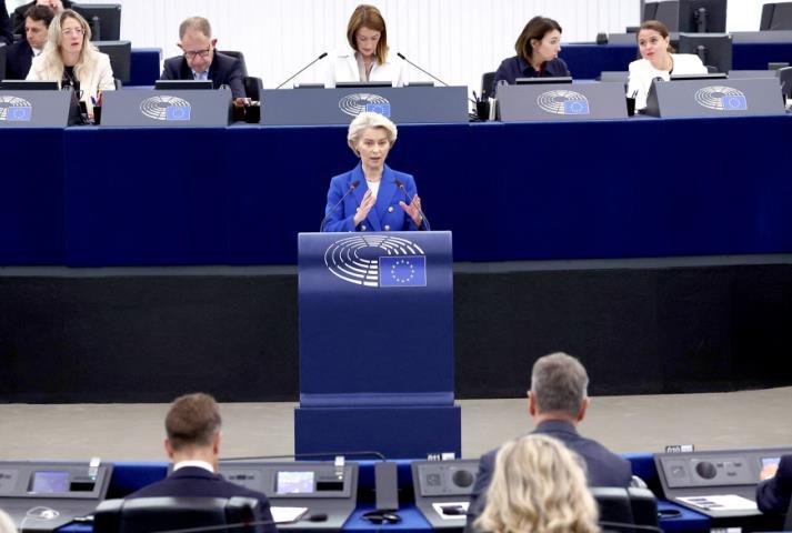 圖為當?shù)貢r間10月8日,法國斯特拉斯堡,歐盟委員會主席馮德萊恩在歐洲議會發(fā)言時談及構(gòu)筑“無人機墻”相關問題。 CFP供圖
