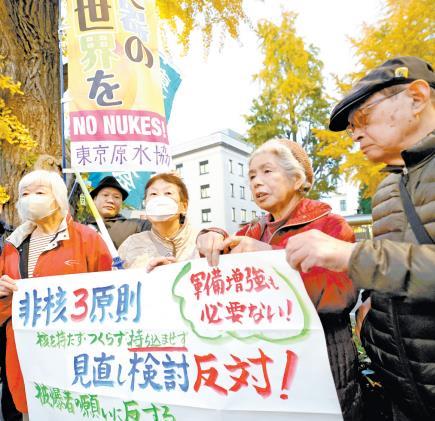 圖為當(dāng)?shù)貢r(shí)間11月21日,日本原子彈氫彈爆炸受害者團(tuán)體協(xié)議會(huì)等組織在日本國會(huì)前舉行抗議活動(dòng),反對(duì)修改“無核三原則”和加強(qiáng)軍備。 CFP供圖