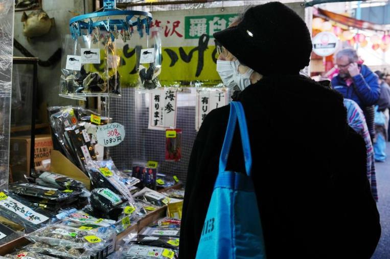 2025年12月18日,在日本東京筑地站附近,顧客在一家店鋪前選購。新華社記者 賈浩成 攝