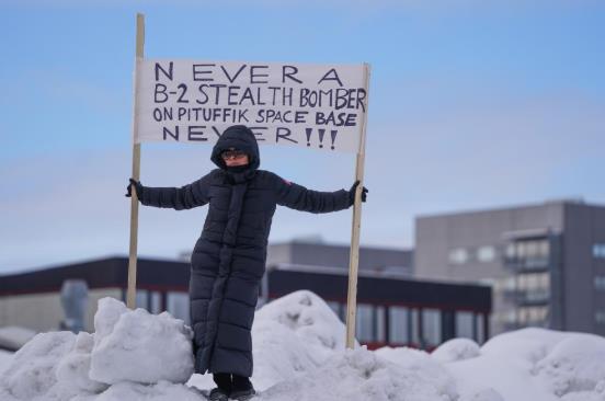 2025年3月28日,在丹麥自治領(lǐng)地格陵蘭島首府努克,一名女子舉著抗議標(biāo)語(yǔ)。新華社記者彭子洋攝