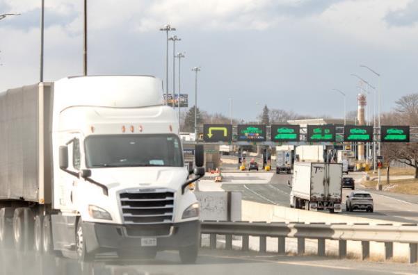 特朗普政府在高等法院裁定總統(tǒng)此前利用緊急法律征收多項關(guān)稅違反美國憲法后,正加緊構(gòu)建新的關(guān)稅制度。圖為當?shù)貢r間2026年3月12日,在加拿大安大略省薩尼亞,美加邊境處的貨運卡車。 CFP供圖