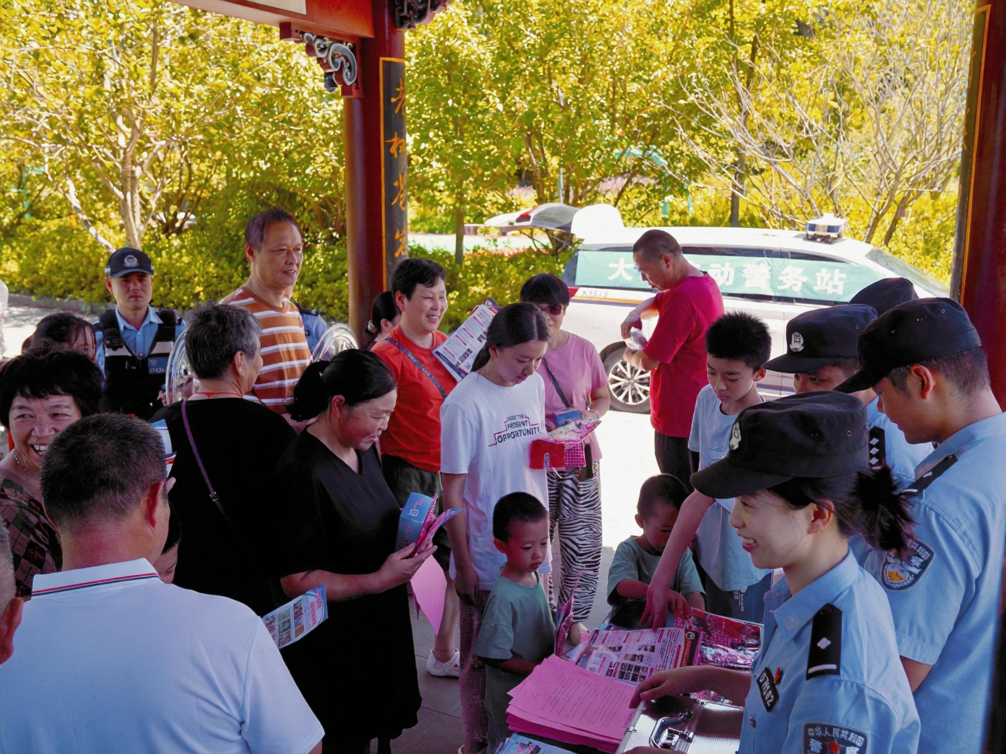 盛夏七月,海拔近千米的大洋鎮(zhèn)迎來避暑客流高峰。綠林中的大洋水庫旁新設(shè)的“警務(wù)涼亭”成了游客歇腳點。7月14日中午,民警張洵正向圍坐的游客遞上涼茶,普及反詐知識。