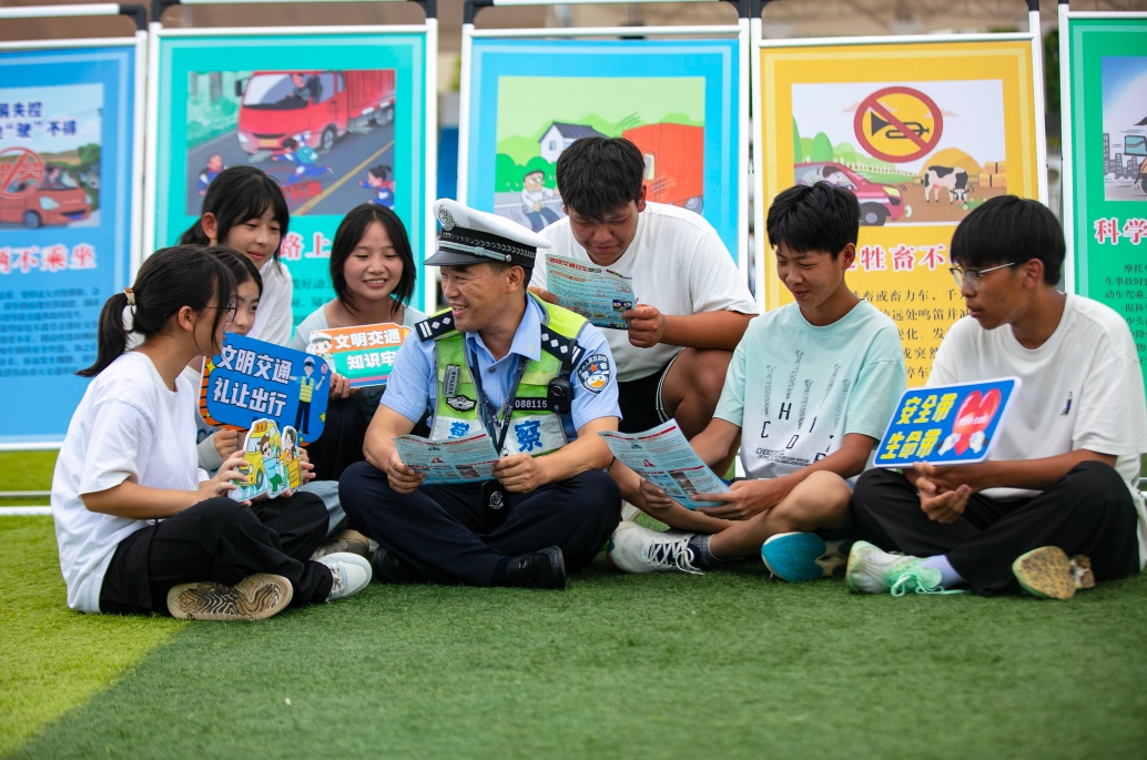 圖為8月28日,民警走進(jìn)橫峰縣職業(yè)中學(xué)軍訓(xùn)現(xiàn)場(chǎng)向同學(xué)們宣傳交通安全法律法規(guī)。