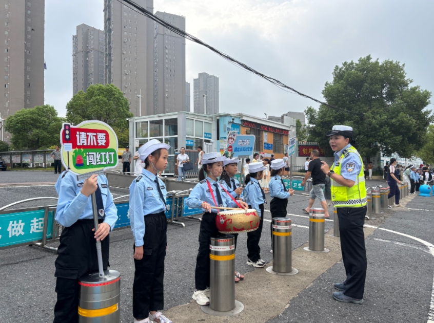 秋季開學伊始,江西省高安市公安局交管大隊組織民輔警和“少年交警隊”隊員在轄區(qū)校園門口維護秩序,充分發(fā)揮“家+校+警”機制作用,通過“小手拉大手”帶動全社會共同關注交通安全。