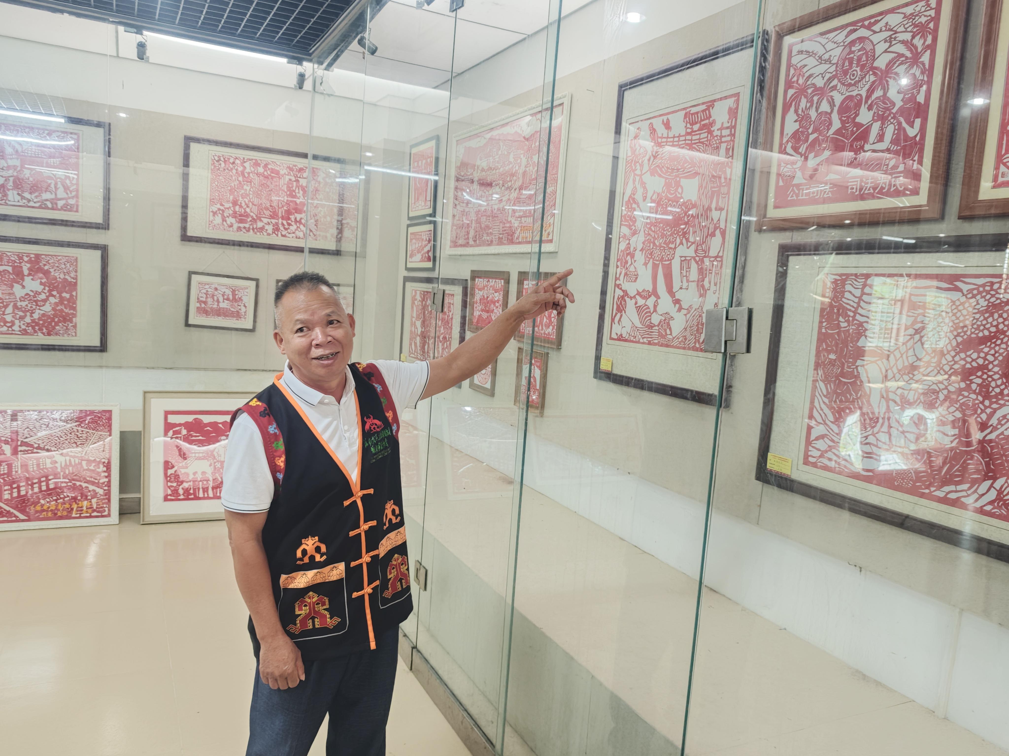 “剪紙以前大多是剪一些吉祥圖案、民族傳說。在縣司法局的指導(dǎo)下,我開始嘗試將法治元素融入剪紙藝術(shù),創(chuàng)作大量的法治題材剪紙作品?!贝蟀布艏埣妓囀〖?jí)傳承人林文生表示,他積極參與法治剪紙進(jìn)校園、進(jìn)鄉(xiāng)村等普法宣傳活動(dòng),讓學(xué)生和黎族村民在欣賞精美剪紙的同時(shí),接受法治文化的熏陶。