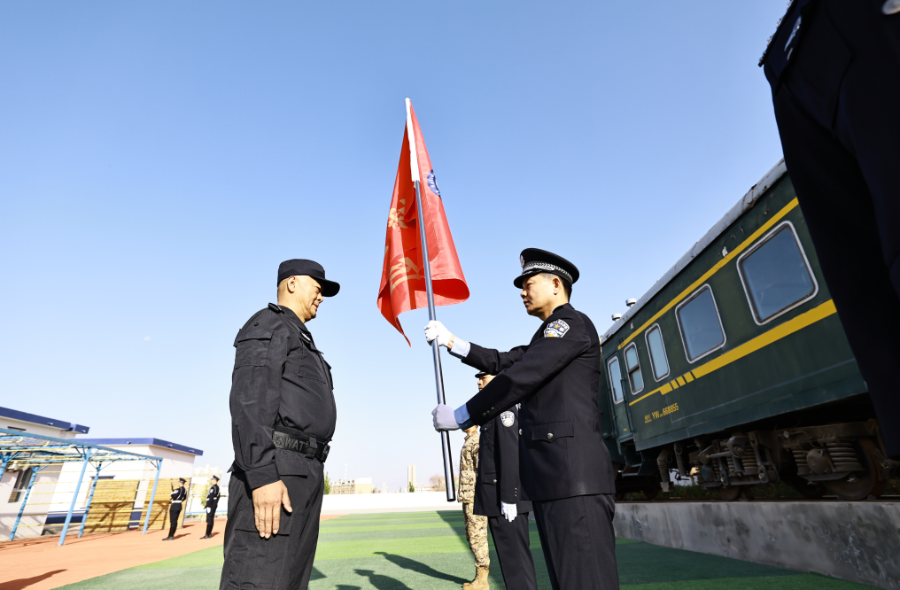 圖為10月10日,烏魯木齊鐵路公安局庫爾勒公安處特警支隊(duì)授旗儀式現(xiàn)場。