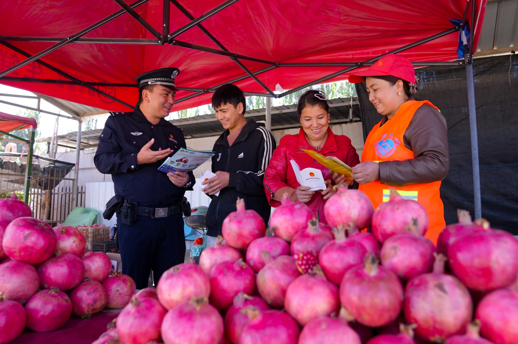 10月12日,新疆維吾爾自治區(qū)葉城縣伯西熱克鎮(zhèn)派出所深入踐行新時代“楓橋經(jīng)驗(yàn)”,組織“石榴大媽”“石榴義警”等走進(jìn)轄區(qū)石榴園區(qū)、流動擺攤路段、合作社及打包點(diǎn)等地,開展常態(tài)化巡邏防控、安全隱患排查、安防普法宣傳和矛盾糾紛調(diào)處工作。民警與義警向群眾講解防盜防騙、交通安全等知識,及時掌握社情民意,化解潛在風(fēng)險,用實(shí)際行動守護(hù)群眾生命財產(chǎn)安全。